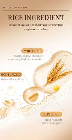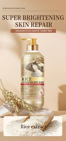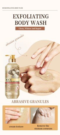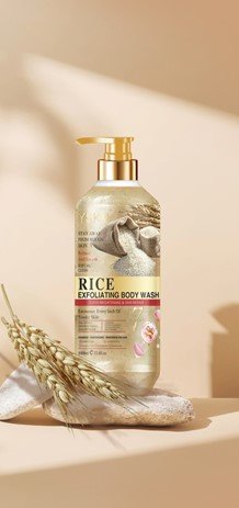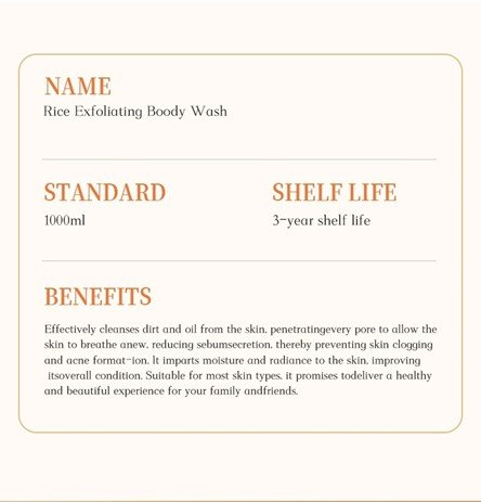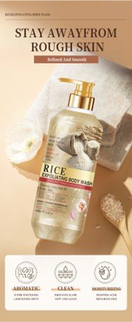 the skin, promoting a healthy and youthful glow. The body wash creates a rich lather that glides effortlessly over the skin, leaving behind a light, refreshing fragrance. Its gentle formula is suitable for all skin types, including sensitive skin, making it a perfect addition to your daily bathing routine. Whether you’re looking to rejuvenate tired skin or simply enjoy a pampering shower experience, our Rice Exfoliating Body Wash provides a natural, effective, and luxurious way to keep your skin clean, soft, and beautifully revitalized.