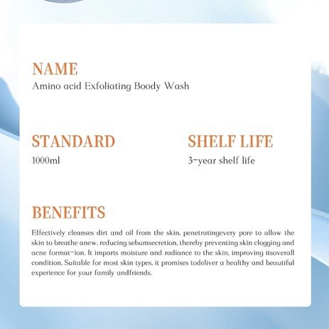 that lingers subtly on the skin, our body wash creates a rich, creamy lather that envelops you in a cloud of indulgence. Its gentle nature makes it suitable for daily use, ensuring that you can enjoy a nourishing and rejuvenating bath or shower experience every day. Whether you’re starting your morning or winding down in the evening, our Amino Acid Body Wash is the perfect choice for those seeking a high – quality, skin – friendly cleansing product that combines effective cleaning with intensive moisturization and skin – loving benefits.